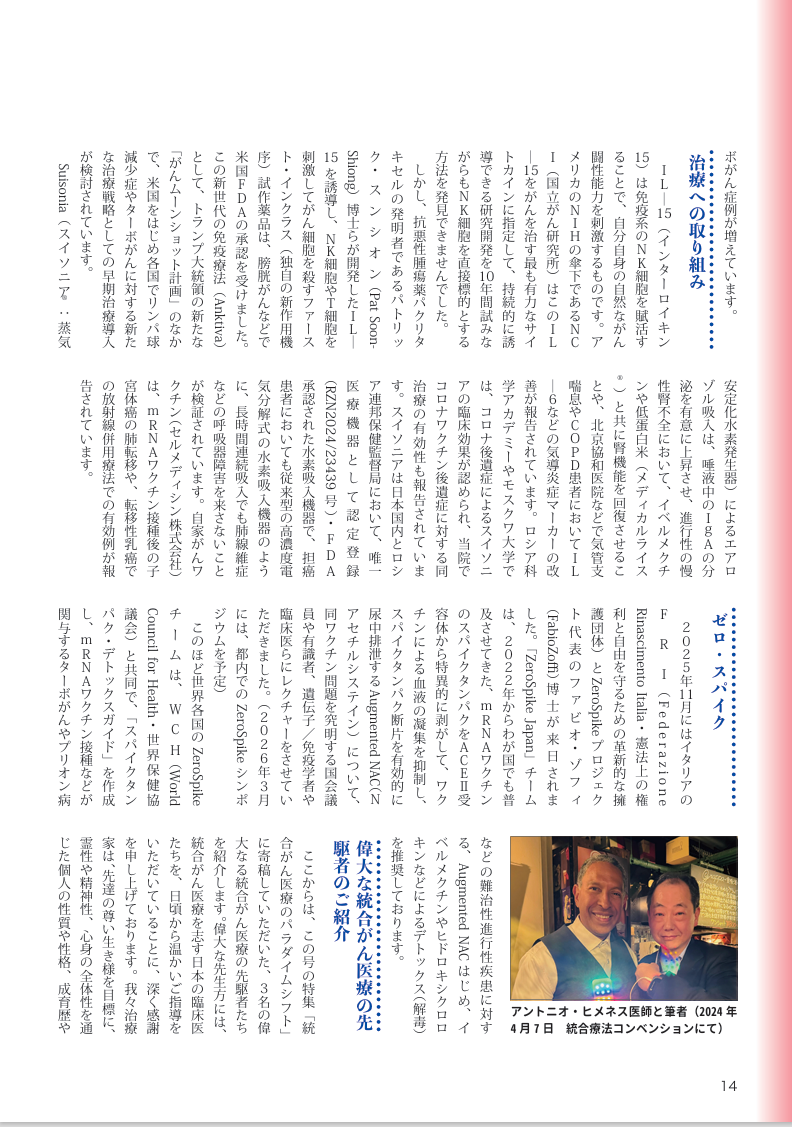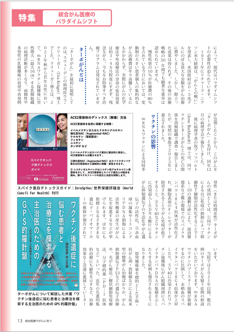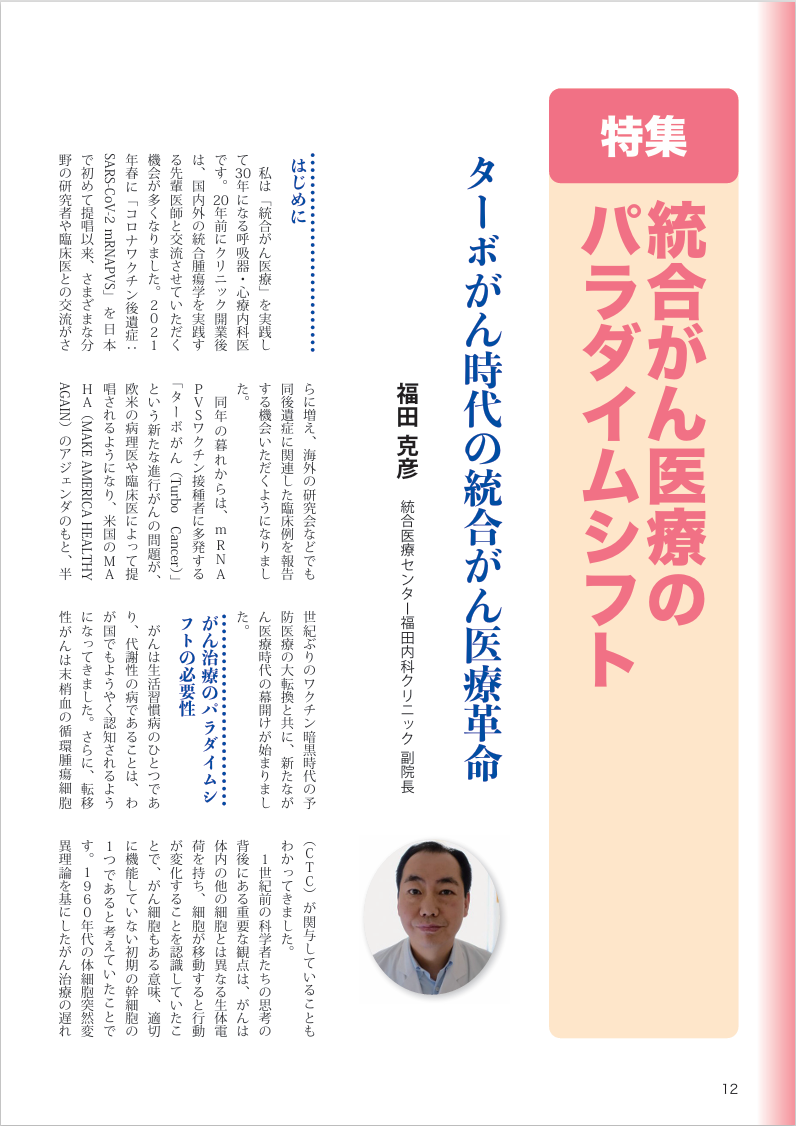 統合医療でがんに克つ 25年1月号 特別インタビュー「私のがん治療」「統合医療でがんに克つ」 200号記念特集の特別インタビューに関しまして、69ページ(2枚目)冒頭に記載されております内容が、当院副院長が、インタビューでお話させていただいた内容とは異なった表現での記事になっておりましたことをお詫びし、以下の通りに訂正致します。